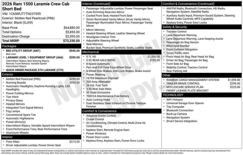 Step inside the Laramie and experience the epitome of comfort and convenience. Enjoy the luxurious leather-trimmed bucket seats, heated front and rear seats, and ventilated front seats. Stay connected with the state-of-the-art Uconnect 5 Navigation system and 12-inch display, along with Apple CarPlay and Android Auto integration. The RamBox Cargo Management System and Trailer Brake Control provide unparalleled versatility and towing capability.