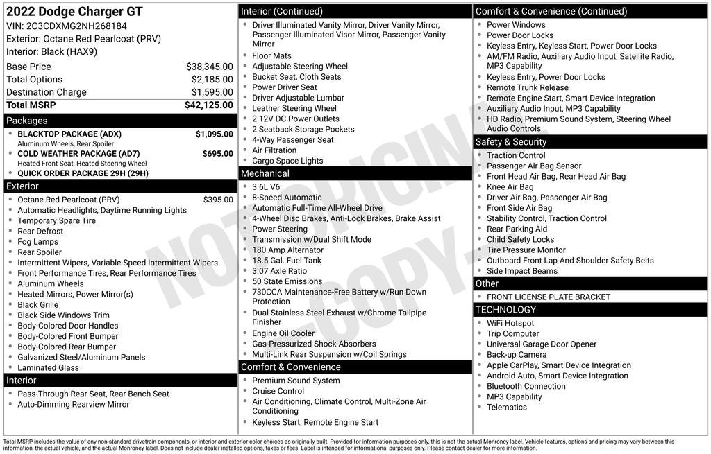 AWD, Black Cloth, 6 Speakers, AM/FM radio: SiriusXM, AWD Rhombi Black Badge, Black 1-Piece Performance Spoiler, Black Badge, Black Dodge Grille Badge, Blacktop Package, Gloss Black I/P Cluster Trim Rings, GPS Antenna Input, Integrated Center Stack Radio, Quick Order Package 29H, Rhombi 2-Pc Wheel Center Cap, Satin Black Charger Decklid Badge, Satin Black Dodge Tail Lamp Badge, Wheels: 20 x 8 Black Noise AWD.