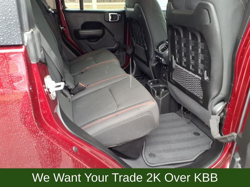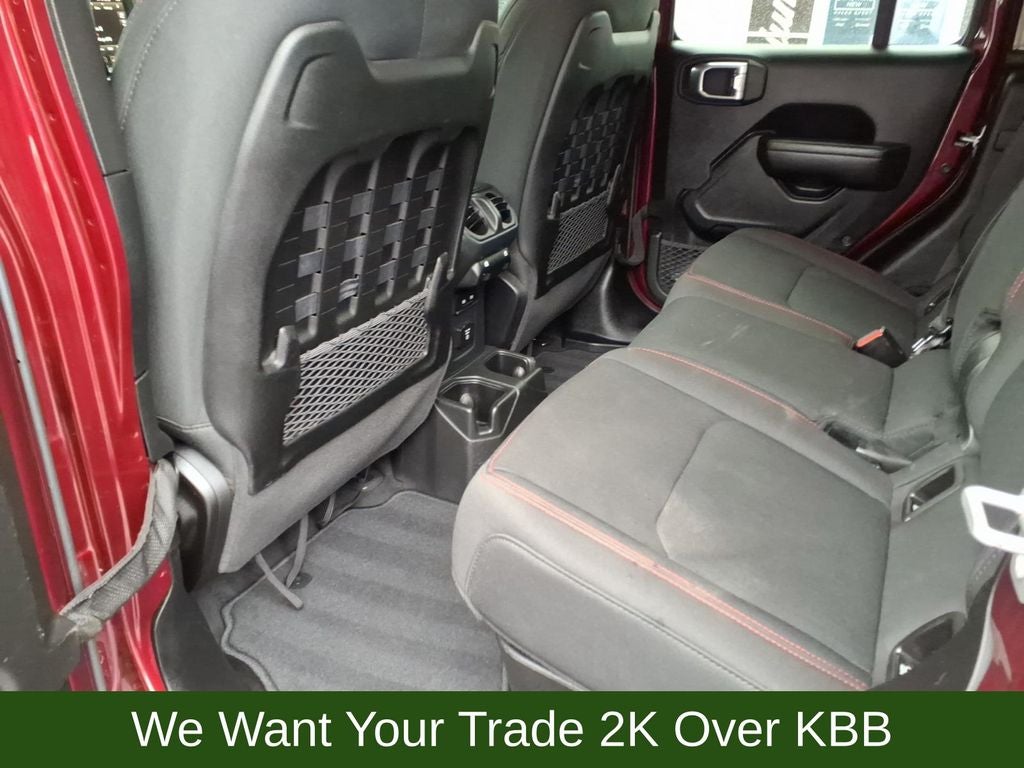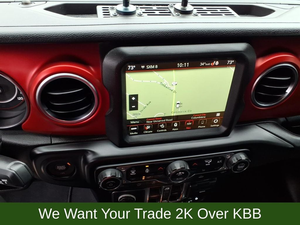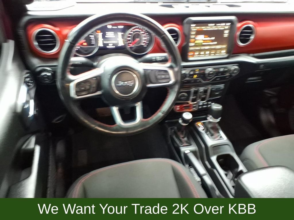 The Gladiator Rubicon's striking Red exterior is complemented by a Black 3-Piece Hard Top, adding a touch of style and versatility. Inside, the premium cloth low-back bucket seats and split-folding rear seat provide ample comfort and utility, while the Uconnect 4C Nav system with an 8.4 display keeps you connected and entertained.