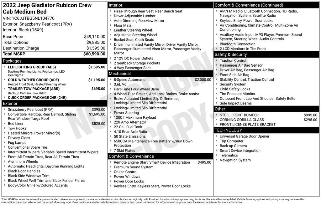 This 2022 Jeep Gladiator Rubicon is the ultimate blend of off-road capability, everyday practicality, and refined style. Experience the thrill of the open road and the freedom of the trail in this exceptional SUV. Contact us today to schedule a test drive and discover why the Gladiator Rubicon is the perfect choice for your next adventure.