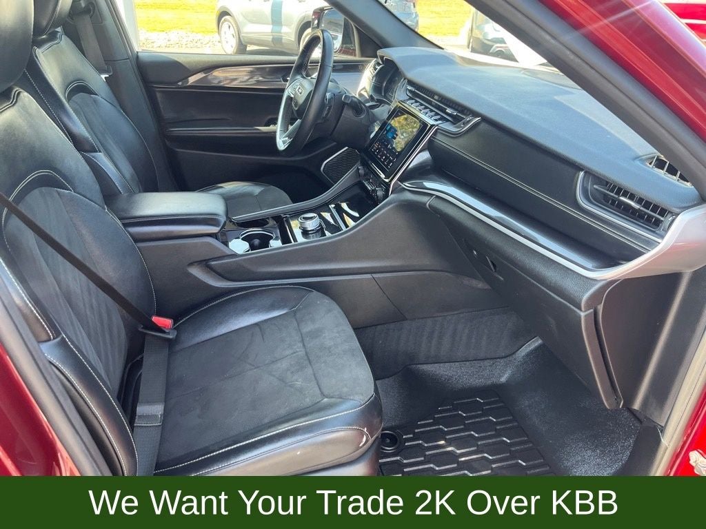 115V Auxiliary Power Outlet, 3.45 Rear Axle Ratio, 3rd Row Charge-Only USB Ports, 3rd row seats: split-bench, 4-Wheel Disc Brakes, 6 Speakers, ABS brakes, Air Conditioning, Alloy wheels, Altitude Appearance Package, AM/FM radio, Anti-whiplash front head restraints, Automatic temperature control, Black Headliner, Brake assist, Bumpers: body-color, Cloth Seats, Compass, Delay-off headlights, Delete Laredo Badge, Driver door bin, Driver vanity mirror, Dual front impact airbags, Dual front side impact airbags, Electronic Stability Control, Emergency communication system, Four wheel independent suspension, Front anti-roll bar, Front Bucket Seats, Front Center Armrest w/Storage, Front dual zone A/C, Front reading lights, Fully automatic headlights, Gloss Black Exterior Accents, Heated door mirrors, Heated Front Seats, Heated Steering Wheel, Illuminated entry, Knee airbag, Leather Trimmed Bucket Seats, Leather Wrapped Steering Wheel, Low tire pressure warning, Manual Fold Seatbacks, Molded In Color Black/Gloss Black Roof Rails, Normal Duty Suspension, Occupant sensing airbag, Outside temperature display, Overhead airbag, Overhead console, Panic alarm, ParkView Rear Back-Up Camera, Passenger door bin, Passenger vanity mirror, Power door mirrors, Power driver seat, Power Liftgate, Power steering, Power windows, Quick Order Package 22B Altitude, Radio data system, Radio: Uconnect 5 w/8.4 Display, Rain Sensitive Windshield Wipers, Rear air conditioning, Rear anti-roll bar, Rear reading lights, Rear window defroster, Rear window wiper, Reclining 3rd row seat, Remote keyless entry, Remote Start System, Security system, Selectable Tire Fill Alert, Speed control, Speed-Sensitive Wipers, Split folding rear seat, Spoiler, Steering wheel mounted audio controls, Tachometer, Telescoping steering wheel, Tilt steering wheel, Traction control, Trip computer, Variably intermittent wipers, Voltmeter, Wheels: 18 x 8.0 Fully Painted Aluminum, Wheels: 20 x 8.5 Gloss Black Painted Aluminum, Wireless Charging Pad.
