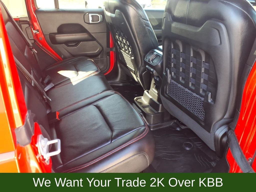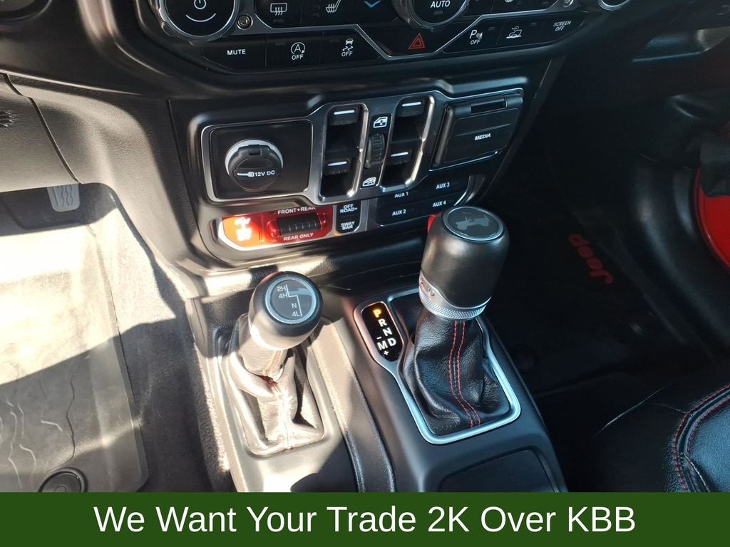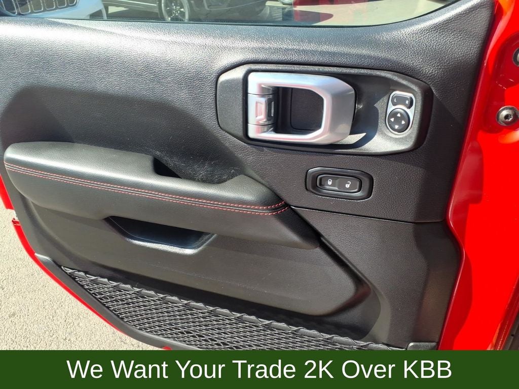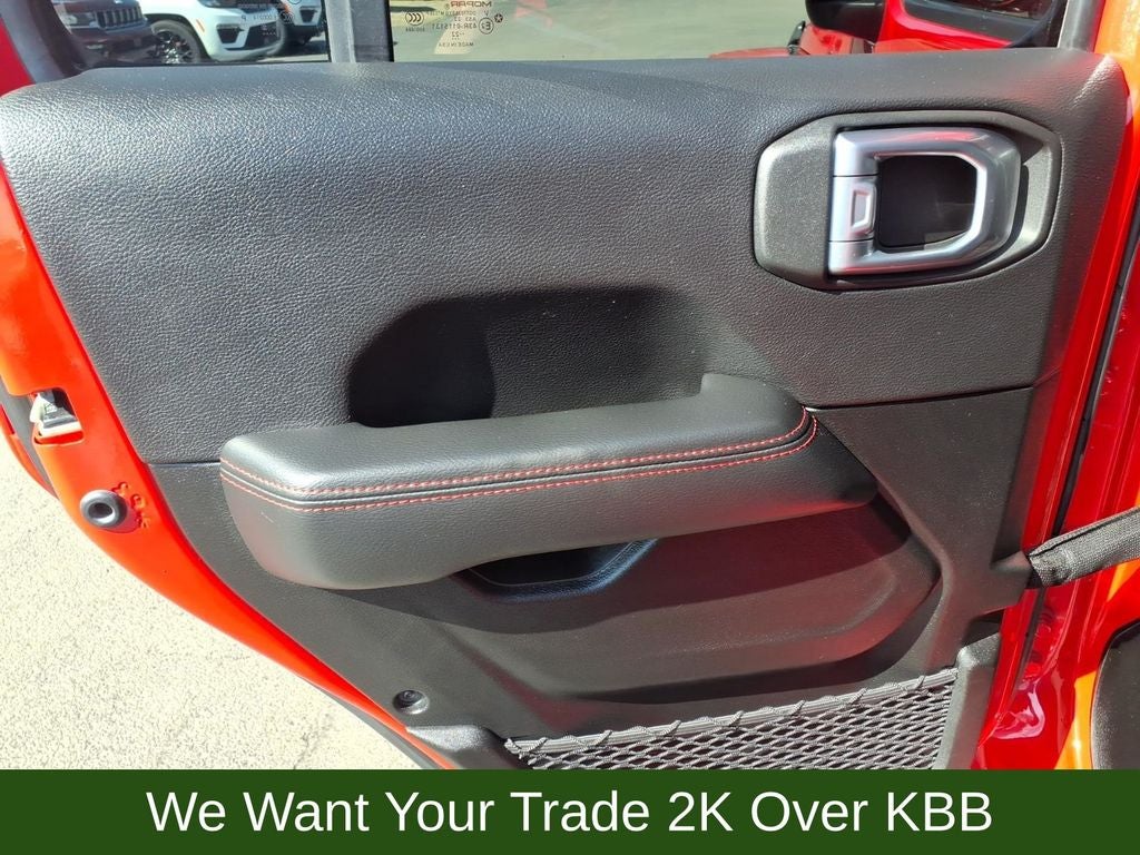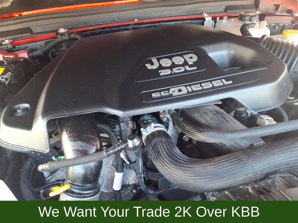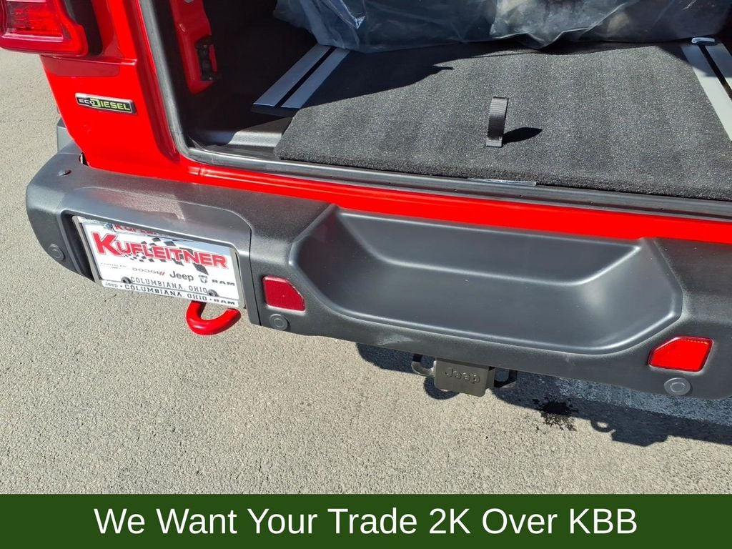 240 Amp Alternator, 4-Wheel Disc Brakes, 7 & 4 Pin Wiring Harness, 700 Amp Maintenance Free Battery, 9 Speakers, ABS brakes, Advanced Brake Assist, Advanced Safety Group, Air Conditioning, Alloy wheels, AM/FM radio: SiriusXM, Apple CarPlay/Android Auto, Auto High Beam Headlamp Control, Auto-dimming Rear-View mirror, Automatic temperature control, Aux Battery, Auxiliary Switches, Blind Spot & Cross Path Detection, Body Color Rubicon Highline Flare, Brake assist, Cargo Compartment Floor Mat, Class II Receiver Hitch, Cold Weather Group, Compass, Corning Gorilla Glass, Daytime Running Lamps LED Accents, Delay-off headlights, Driver door bin, Driver vanity mirror, Dual front impact airbags, Dual front side impact airbags, Electronic Stability Control, Emergency communication system: SiriusXM Guardian, Engine Oil Cooler, Front anti-roll bar, Front Bucket Seats, Front Center Armrest w/Storage, Front dual zone A/C, Front fog lights, Front LED Fog Lamps, Front reading lights, Full Speed Forward Collision Warning Plus, Fully automatic headlights, Garage door transmitter, Heated door mirrors, Heated Front Seats, Heated Steering Wheel, Illuminated entry, Integrated Off-Road Camera, Integrated roll-over protection, Jeep Trail Rated Kit, Leather steering wheel, LED Lighting Group, LED Premium Reflector Headlamps, LED Taillamps, Low tire pressure warning, MOPAR 3.0L Diesel Hood Graphic, MOPAR All-Weather Floor Mats, MOPAR Hinge-Gate Reinforcement, MOPAR Stainless Door Sill Guards, Navigation System, Non-Lock Fuel Cap w/o Discriminator, Occupant sensing airbag, Outside temperature display, Panic alarm, ParkSense Rear Park Assist System, ParkView Rear Back-Up Camera, Passenger door bin, Passenger vanity mirror, Performance Suspension, Power door mirrors, Power steering, Power Top Quarter Window Storage Bag, Power windows, Premium Cloth Low-Back Bucket Seats, Quick Order Package 26R, Radio data system, Radio: Uconnect 4C Nav w/8.4 Display, Rear anti-roll bar, Rear reading lights, Rear Window Defroster, Rear Window Wiper/Washer, Remote keyless entry, Remote Start System, Removable Rear Quarter Windows, Safety Group, Security system, Sky 1-Touch Power Top, Speed control, Split folding rear seat, Steel Bumper Group, Steel Front Bumper, Steel Rear Bumper, Steering wheel mounted audio controls, Stop-Start Dual Battery System, Tachometer, Telescoping steering wheel, Tilt steering wheel, Traction control, Trail Rail Management System, Trailer Tow & HD Electrical Group, Trip computer, Variably intermittent wipers, Voltmeter, Wheels: 17 x 7.5 Machined w/Black Pockets.