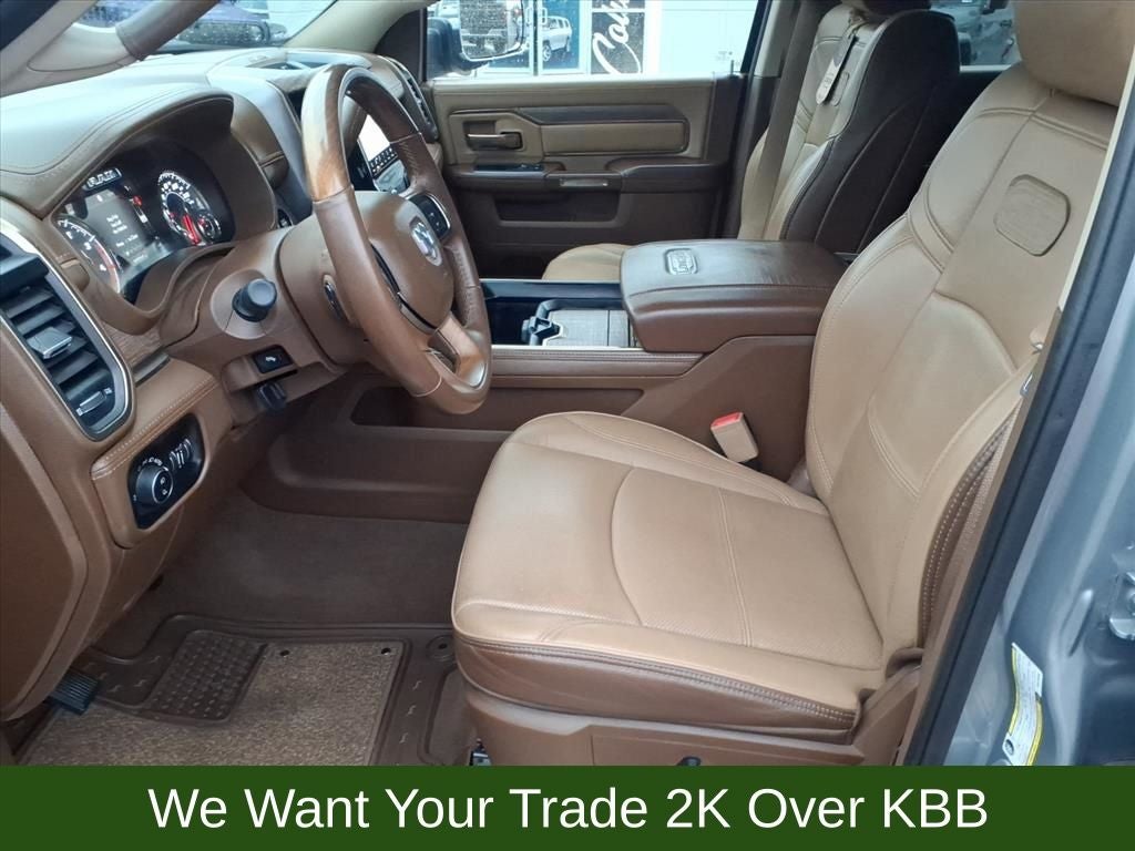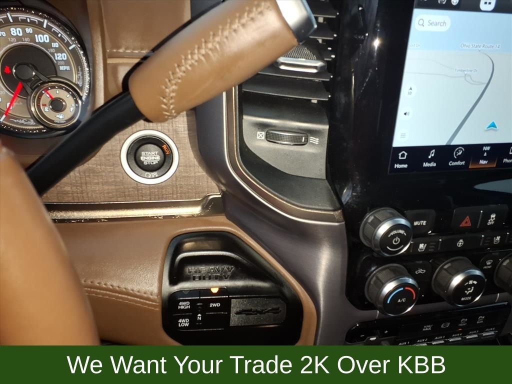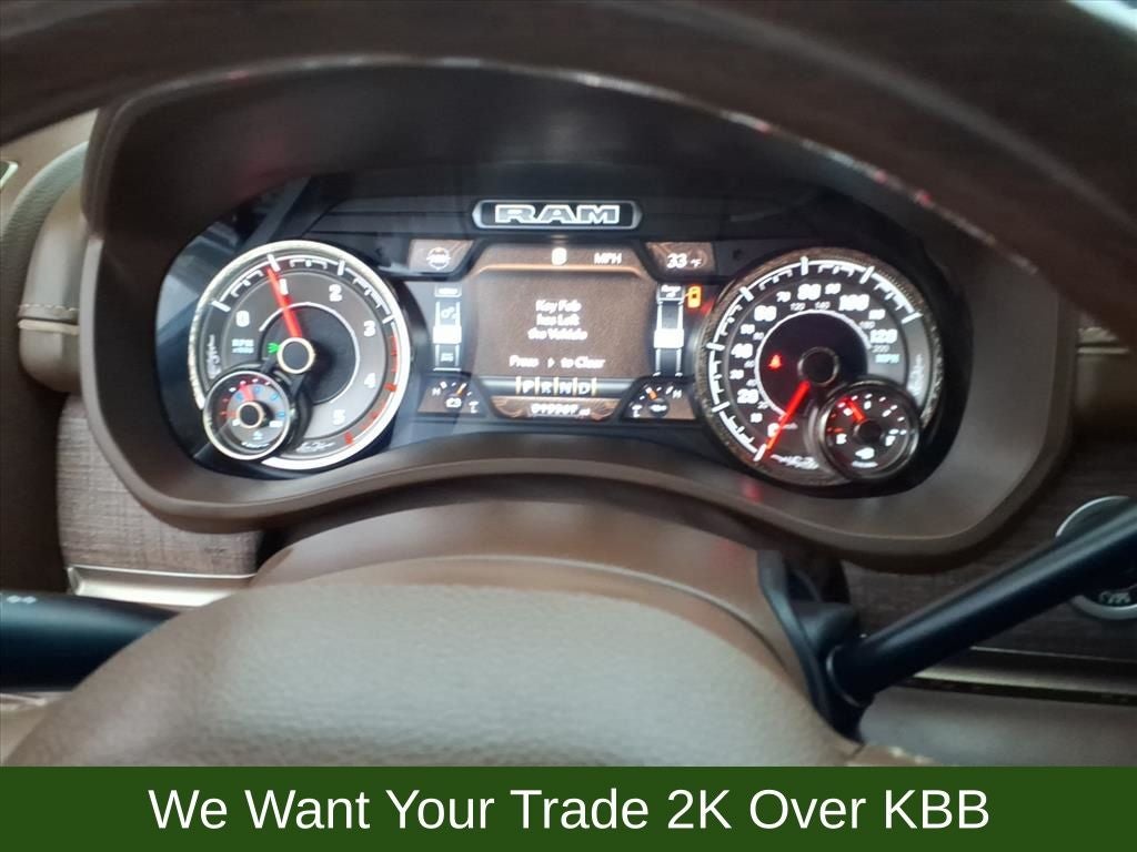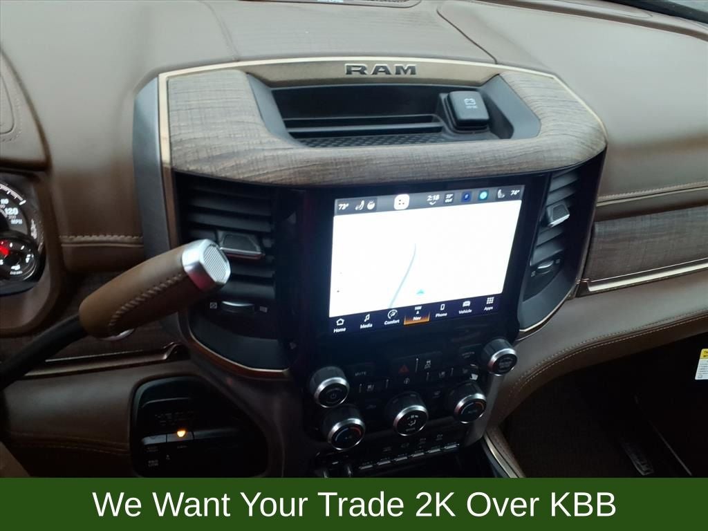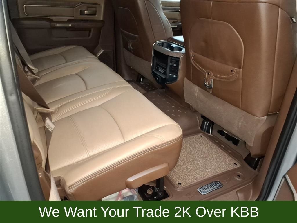 10 Speakers, 115V Auxiliary Rear Power Outlet, 2 Way Rear Headrest Seat, 220 Amp Alternator, 3.73 Axle Ratio, 4 Way Front Headrests, 4-Wheel Disc Brakes, 4G LTE Wi-Fi Hot Spot, 8.4 Touchscreen Display, ABS brakes, Active Noise Control System, Adjustable pedals, Air Conditioning, Alexa Built-In, Alloy wheels, AM/FM radio: SiriusXM with 360L, Anti-Spin Differential Rear Axle, Apple CarPlay, Apple CarPlay/Android Auto, Audio memory, Auto High-beam Headlights, Auto-dimming Rear-View mirror, Automatic temperature control, Brake assist, Bucket Seats, Bumpers: chrome, Center Hub, Chrome Flat Wheel-to-Wheel Side Steps, Clearance Lamps, Compass, Connected Travel & Traffic Services, Connectivity - US/Canada, Dash Pass Thru Wire Circuits, Delay-off headlights, Disassociated Touchscreen Display, Driver door bin, Driver vanity mirror, Dual front impact airbags, Dual front side impact airbags, Electronic Stability Control, Electronically Controlled Throttle, Engine Block Heater, Front anti-roll bar, Front Bucket Seats, Front Center Armrest w/Storage, Front dual zone A/C, Front fog lights, Front reading lights, Front Seat Back Map Pockets, Full Length Premium Upgraded Floor Console, Fully automatic headlights, Garage door transmitter, Genuine wood console insert, Genuine wood dashboard insert, Genuine wood door panel insert, Global Telematics Box Module (TBM), Google Android Auto, GPS Antenna Input, GPS Navigation, HD Radio, Heated door mirrors, Heated Front Seats, Heated front seats, Heated rear seats, Heated Second Row Seats, Heated Steering Wheel, Heated steering wheel, High Back Seats, I/P Mounted Auxiliary Switches, Illuminated entry, Integrated Center Stack Radio, Integrated Voice Command w/Bluetooth®, Leather steering wheel, Low tire pressure warning, Memory seat, Navigation System, Occupant sensing airbag, Off-Road Information Pages, Outside temperature display, Overhead airbag, Overhead console, Panic alarm, ParkView Rear Back-Up Camera, Passenger door bin, Passenger vanity mirror, Pedal memory, Power 2-Way Driver Lumbar Adjust, Power 2-Way Passenger Lumbar Adjust, Power Adjust 8-Way Driver Seat, Power Adjust 8-Way Front Passenger Seat, Power door mirrors, Power driver seat, Power passenger seat, Power steering, Power windows, Premium Filigree Leather Seats, Quick Order Package 2HK Longhorn, Radio data system, Radio: Uconnect 5 Nav w/8.4 Display, Radio/Driver Seat/Mirrors/Pedals Memory, Rain sensing wipers, Rear 60/40 Folding Seat, Rear anti-roll bar, Rear reading lights, Rear seat center armrest, Rear step bumper, Rear window defroster, Remote keyless entry, Security system, Selectable Tire Fill Alert, SiriusXM Radio Service, SiriusXM w/360L, Snow Chief Group, Speed control, Split folding rear seat, Steering wheel mounted audio controls, Tachometer, Tilt steering wheel, Tip Start, Traction control, Trip computer, Turn signal indicator mirrors, Variably intermittent wipers, Vendor Painted Cargo Box, Vendor Painted Cargo Box Tracking, Ventilated Front Seats, Ventilated front seats, Voltmeter, Wheels: 18 x 8.0 Diamond Cut Face Aluminum, Wheels: 18 x 8.0 Polished Aluminum.
