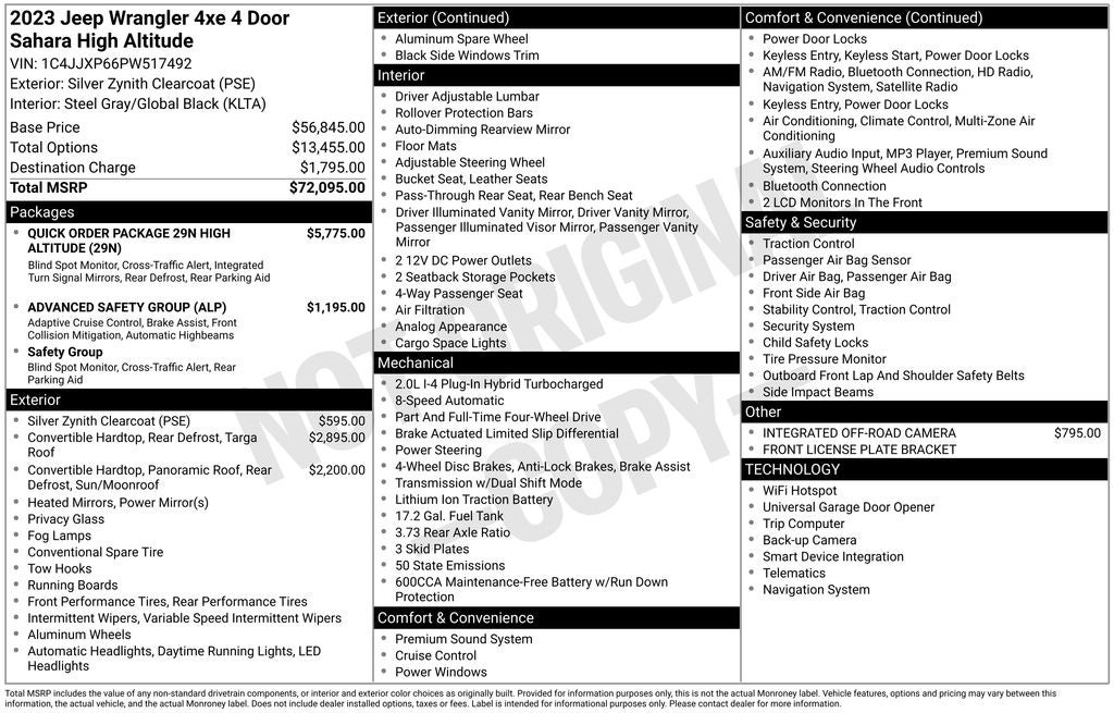 The Jeep Wrangler Sahara 4xe is more than just a capable off-road companion; it's a statement of your adventurous spirit. With its advanced safety features, including Adaptive Cruise Control, Blind Spot Monitoring, and Forward Collision Warning, you can explore the great outdoors with the utmost peace of mind.