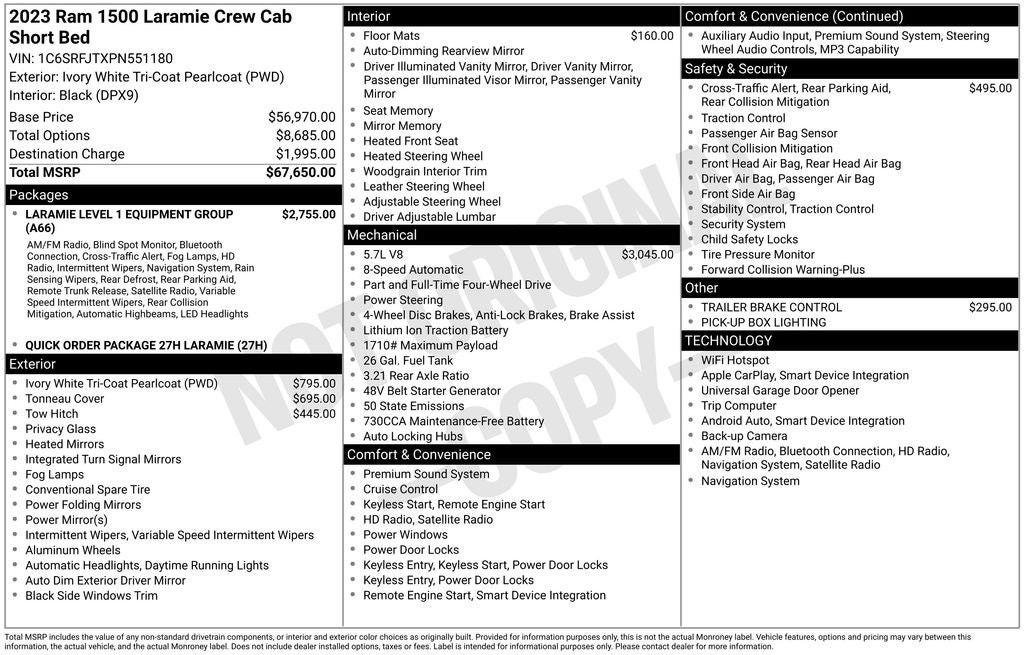 2023 Ivory White Tri-Coat Pearlcoat Ram 1500 Laramie 4WD 8-Speed Automatic HEMI 5.7L V8 Multi Displacement VVT eTorque