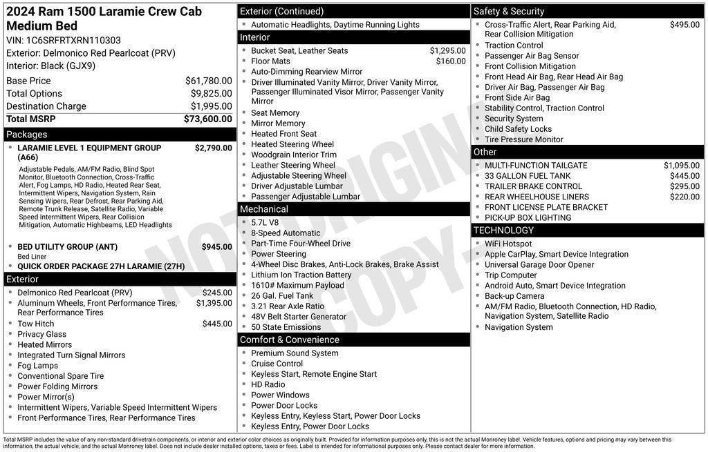 2024 Delmonico Red Pearlcoat Ram 1500 Laramie 4WD 8-Speed Automatic HEMI 5.7L V8 Multi Displacement VVT eTorque