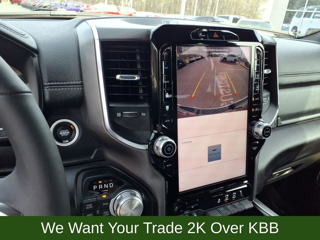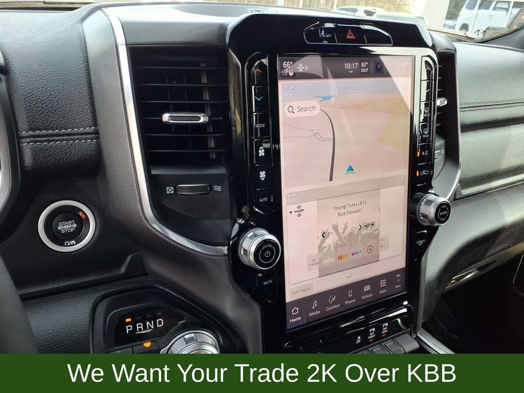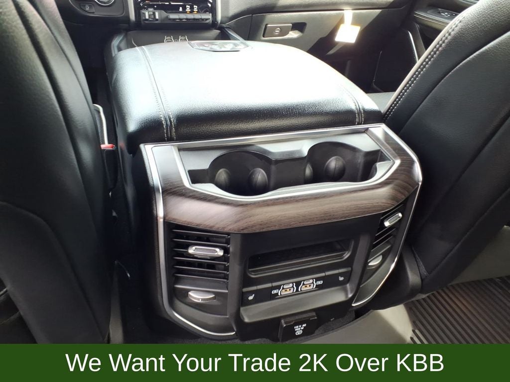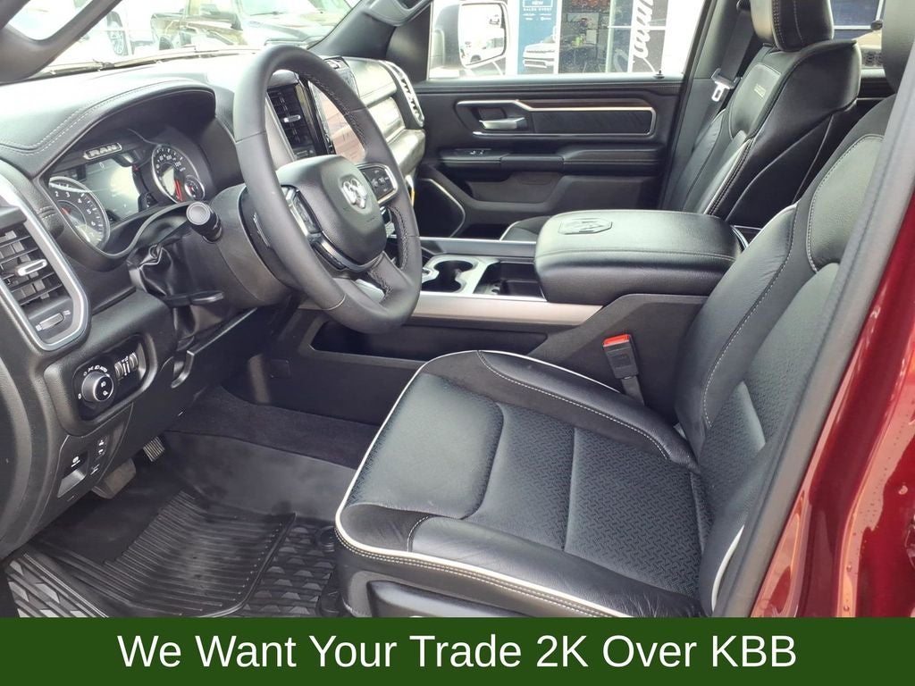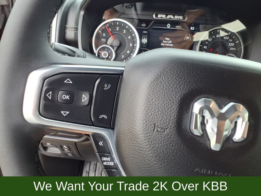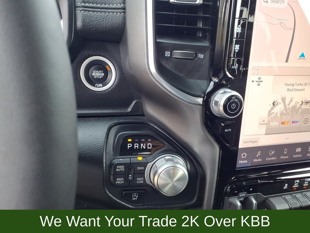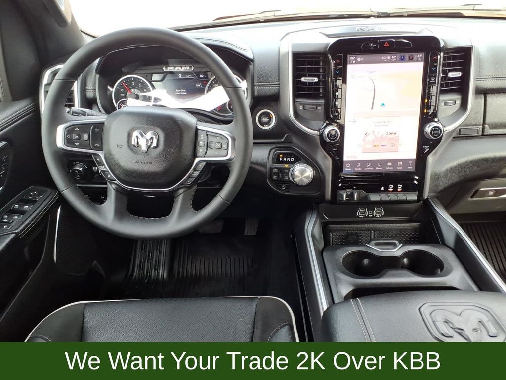 10 Speakers, 3 Rear Seat Head Restraints, 3.55 Rear Axle Ratio, 33 Gallon Fuel Tank, 4 Way Front Headrests, 4-Wheel Disc Brakes, 4G LTE Wi-Fi Hot Spot, ABS brakes, Air Conditioning, Alloy wheels, AM/FM radio: SiriusXM with 360L, Apple CarPlay, Apple CarPlay/Android Auto, Audio memory, Auto High-beam Headlights, Auto Power-Folding Mirrors, Auto-dimming door mirrors, Auto-Dimming Exterior Driver Mirror, Auto-dimming Rear-View mirror, Automatic temperature control, Bed Utility Group, Brake assist, Bumpers: chrome, Chrome Exterior Mirrors, Compass, Connected Travel & Traffic Services, Connectivity - US/Canada, Convex Wide-Angle Exterior Mirror Insert, Delay-off headlights, Driver door bin, Driver Seat Memory, Driver vanity mirror, Dual front impact airbags, Dual front side impact airbags, Electronic Stability Control, Exterior Mirrors Courtesy Lamps, Exterior Mirrors w/Heating Element, Exterior Mirrors w/Memory, Exterior Mirrors w/Supplemental Signals, Front anti-roll bar, Front Center Armrest w/Storage, Front dual zone A/C, Front fog lights, Front License Plate Bracket, Front reading lights, Front Seat Back Map Pockets, Front wheel independent suspension, Fully automatic headlights, Garage door transmitter, Google Android Auto, GPS Antenna Input, GPS Navigation, HD Radio, Heated door mirrors, Heated Front Seats, Heated front seats, Heated rear seats, Heated Steering Wheel, Heated steering wheel, Illuminated entry, Integrated Voice Command w/Bluetooth®, Laramie Level 1 Equipment Group, Leather steering wheel, Leather Trim 40/20/40 Bench Seat, Low tire pressure warning, Memory seat, MOPAR 4 Adjustable Cargo Tie-Down Hooks, MOPAR Front & Rear Rubber Floor Mats, MOPAR Spray In Bedliner, Navigation System, Occupant sensing airbag, Outside temperature display, Overhead airbag, Overhead console, Panic alarm, ParkView Rear Back-Up Camera, Passenger door bin, Passenger vanity mirror, Power 2-Way Driver Lumbar Adjust, Power 2-Way Passenger Lumbar Adjust, Power Adjust 8-Way Front Passenger Seat, Power door mirrors, Power driver seat, Power passenger seat, Power steering, Power windows, Quick Order Package 21H Laramie, Radio data system, Radio: Uconnect 5 Nav w/12.0 Display, Rain Sensitive Windshield Wipers, RAM Grille Badge - Chrome, Rear anti-roll bar, Rear reading lights, Rear seat center armrest, Rear step bumper, Remote keyless entry, Remote Tailgate Release, Security system, SiriusXM w/360L, Speed control, Split folding rear seat, Steering wheel mounted audio controls, Tachometer, Telescoping steering wheel, Tilt steering wheel, Traction control, Trailer Brake Control, Trip computer, Turn signal indicator mirrors, USB Host Flip, Variably intermittent wipers, Ventilated Front Seats, Ventilated front seats, Voltmeter, Wheel to Wheel Side Steps, Wheels: 20 x 9 Premium Paint/Polish.